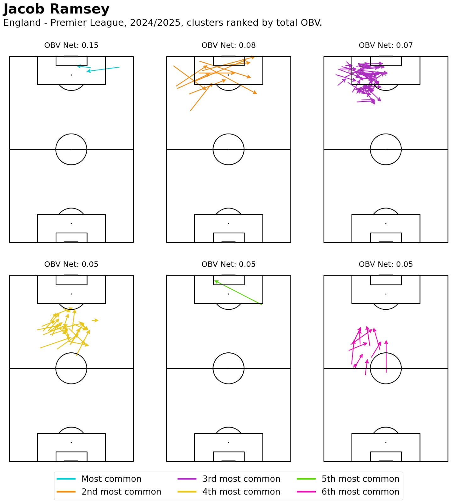 When we look more closely at the most frequently recurring types of high-value passes that Ramsey likes to play, we can see some clusters of similar activity: