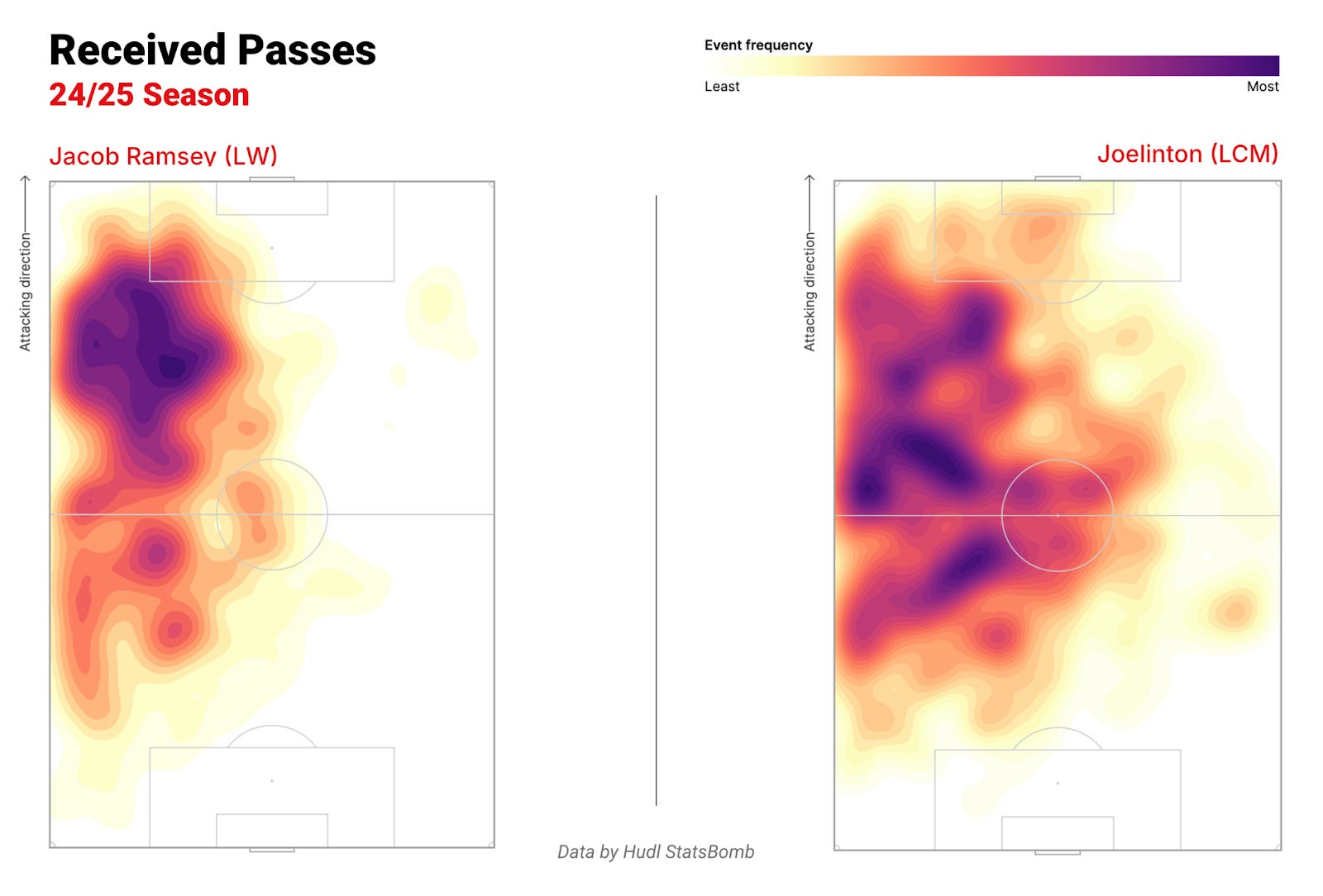 To illustrate that I’m not just a ‘Tactico’ with a screenshot of an out-of-context moment of a midfielder ended up on the wing to make a subjective point, here’s a heatmap of ball receipts of Ramsey (left) and Joelinton (right) to show the overlap in attacking areas.