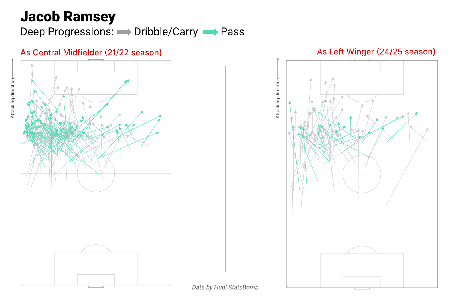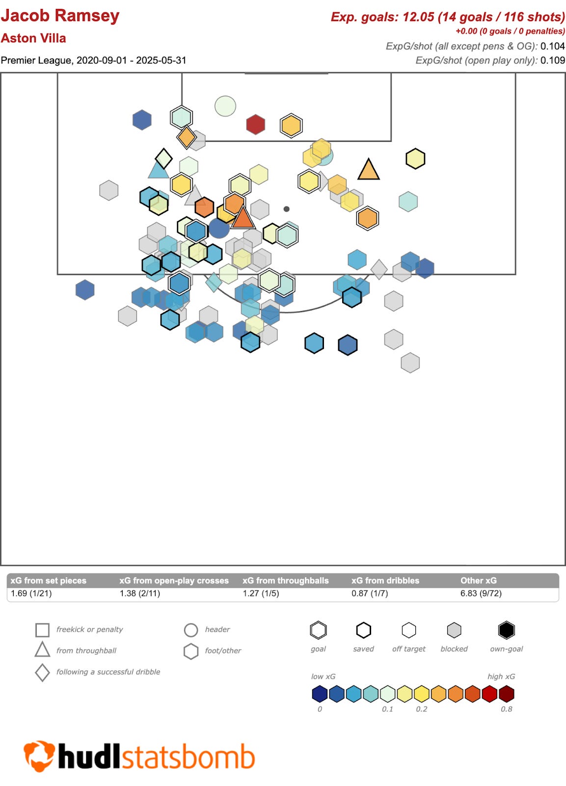 Before we look at any data, I'll add some context. Ramsey (nicknamed “JJ”) is 24 & a former England U21 international midfielder who came through Villa’s academy. Since 20/21, he has been asked to play a variety of roles for Villa as their squad evolved into Top-6 challengers.