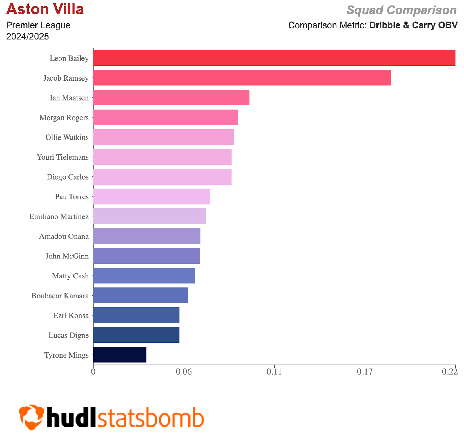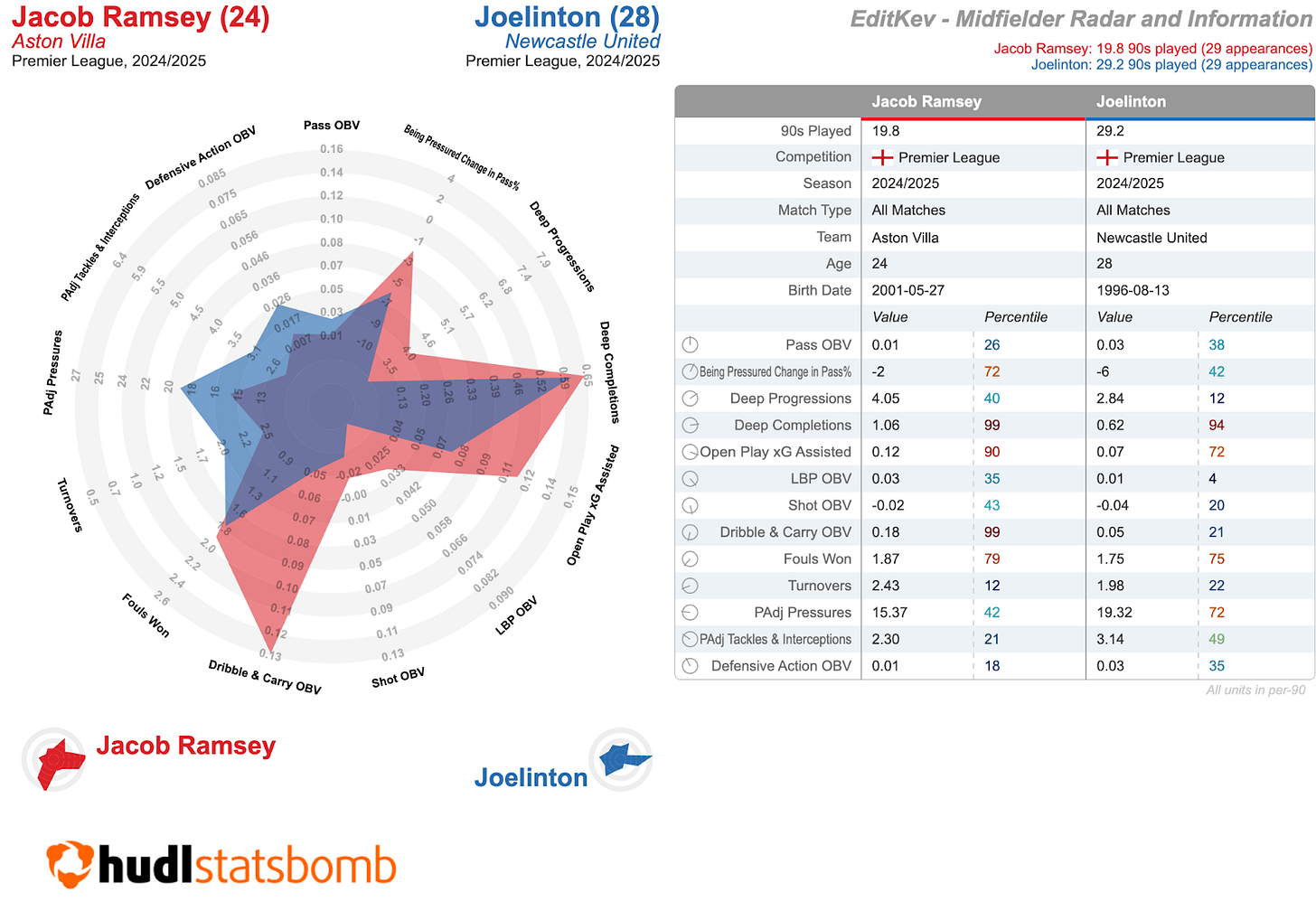 I’ll start with an area where Ramsey is a big upgrade: dribbling. While Joelinton can move the ball, Ramsey’s carrying is elite, with only Leon Bailey at Aston Villa higher on Dribble & Carry On Ball-Value among 900+ minute players in 24/25.