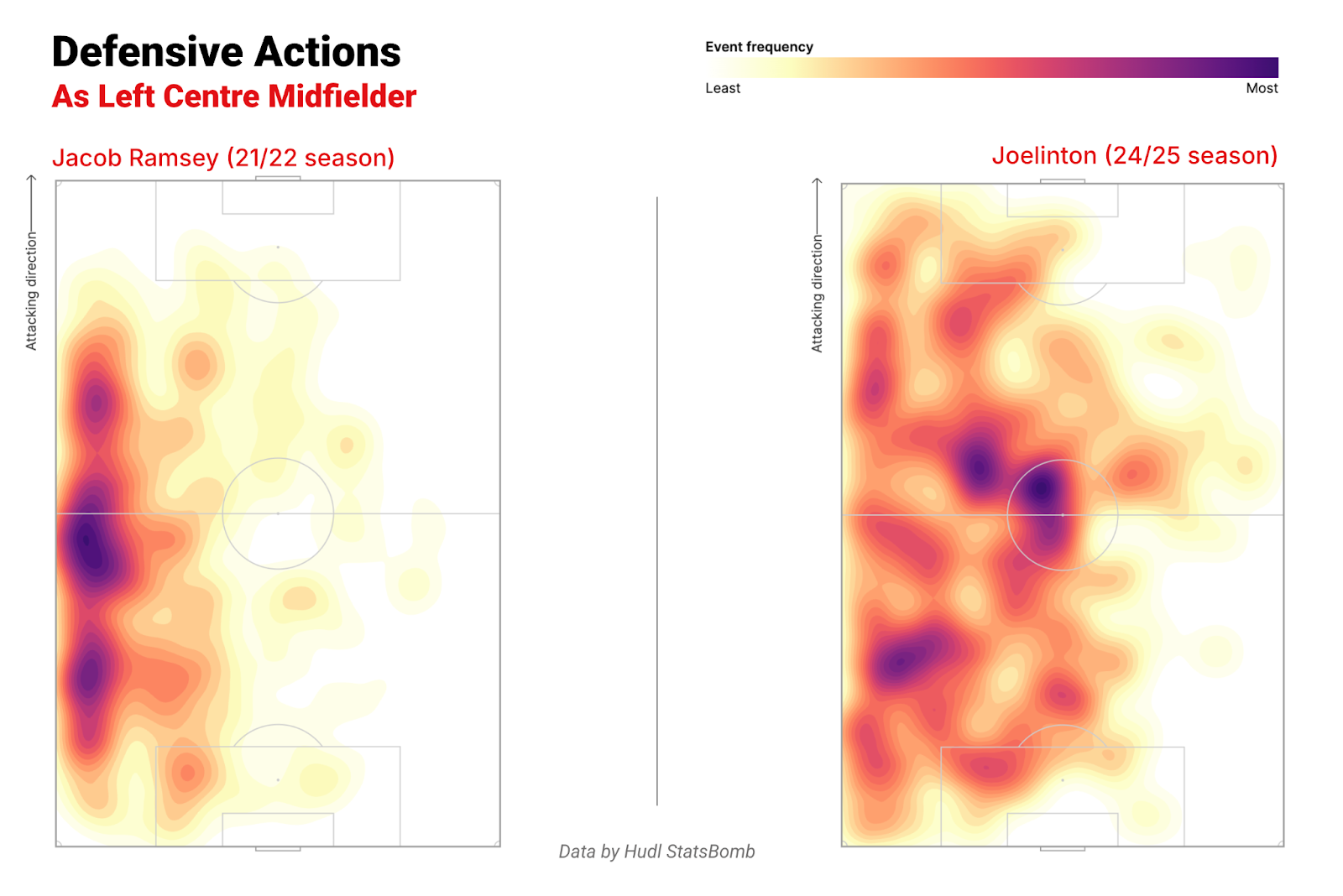 While the two men have been played in different systems, when played at LCM, Ramsey's ability to cover space off the ball is not at Joelinton’s level. To be quite frank, few pros are genuinely capable of that sort of pitch coverage.
