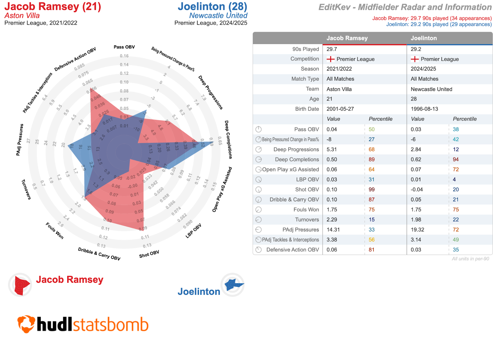 With that context front of mind, let’s compare Ramsey’s 24/25 performances 🔴 vs. Joelinton’s 23/24 season 🔵, using a template that highlights the performance metrics Newcastle value in midfielders. Note Ramsey’s diminished defensive output from the wing.