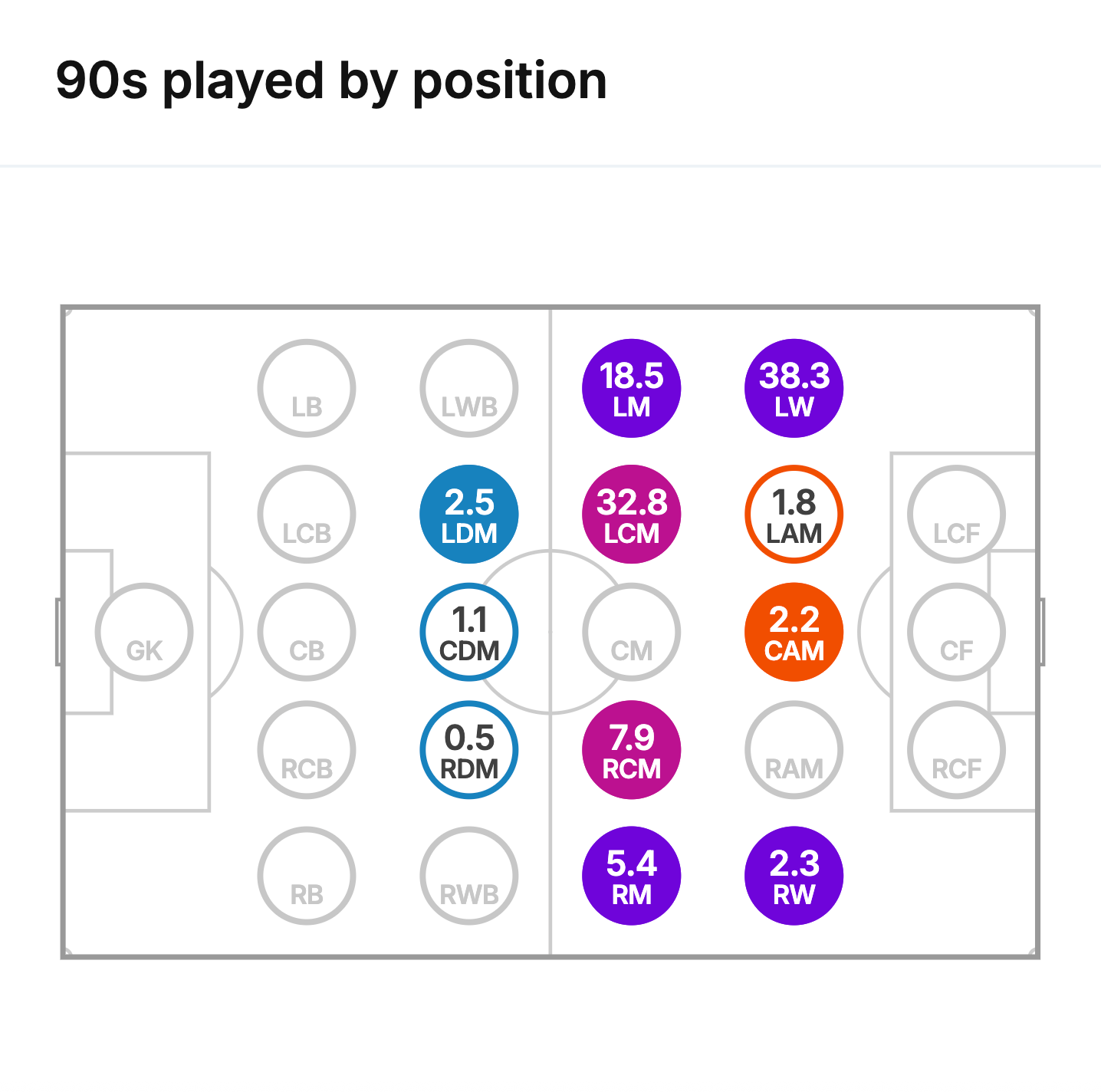 Additionally, because the left-sided central midfield role at Newcastle (see 🔵 dot) combines the traits of a box-to-box midfielder with those of a winger - receiving between the lines, creating from wide areas, crashing the box - his 24/25 data also provides us with valuable insights.