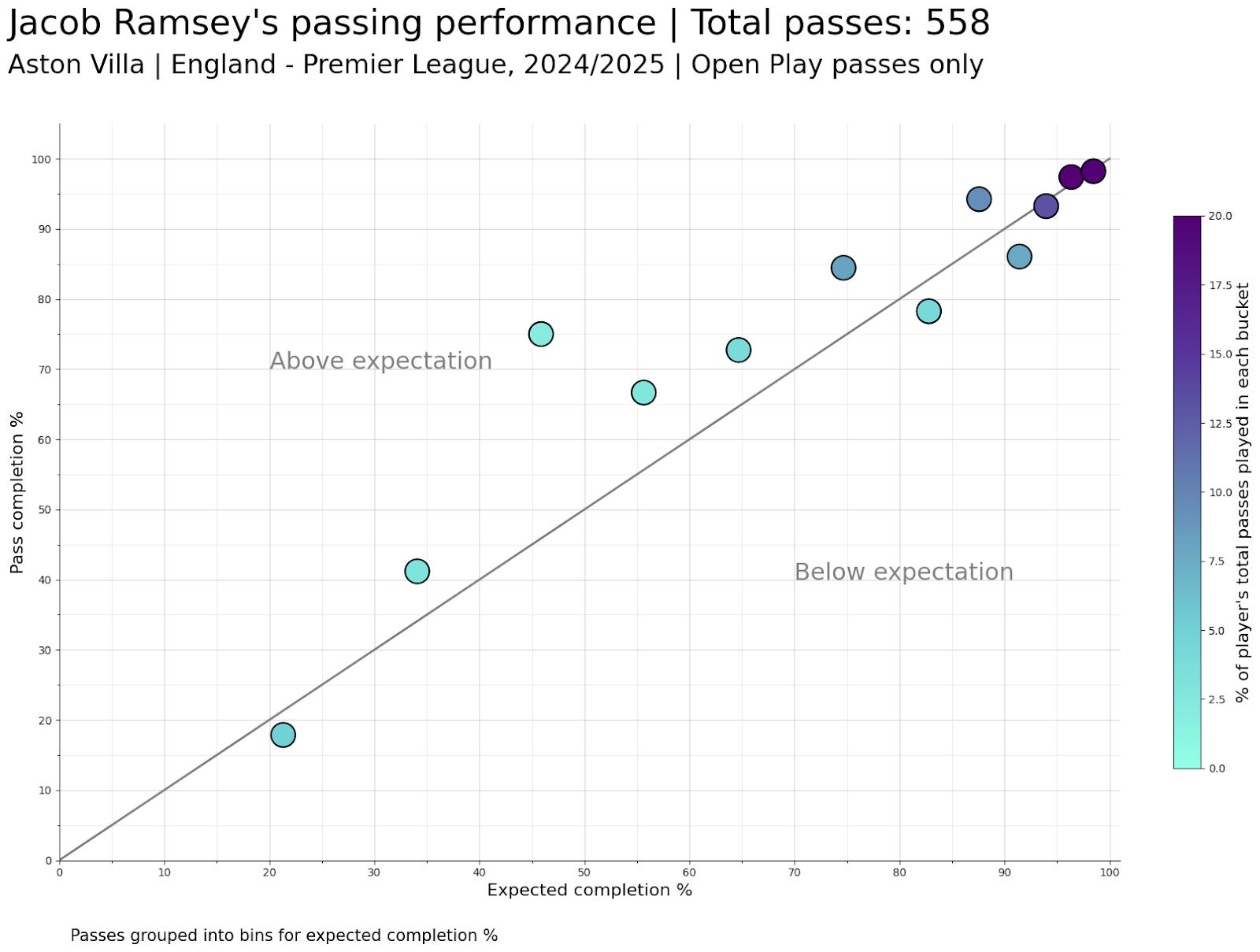 Now compare this to Ramsey, where his passes are mostly completed above the expected averages. I don’t like being hard on Joelinton about this - he is a converted striker after all - but the combination of Ramsey's improved dribbling & passing is going to help break down stubborn defences.
