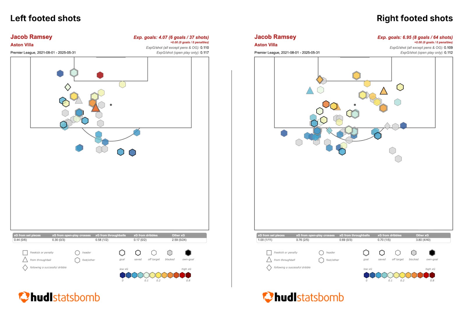 Despite being a low-volume shooter, something that makes him less suited to playing wide, when afforded the right opportunity, Ramsey is a very classy finisher and strikes the ball cleanly using either foot and has 14 EPL goals since 20/21.