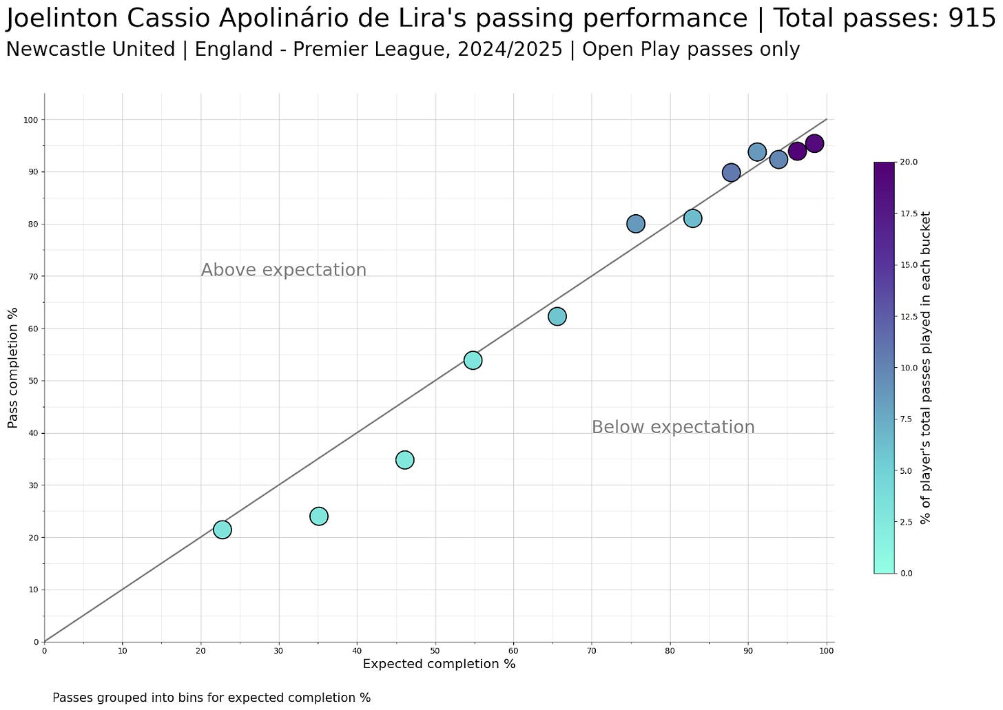 Below is a plot of Joelinton’s passes vs. expected completion rates; nearly everything is below the average.