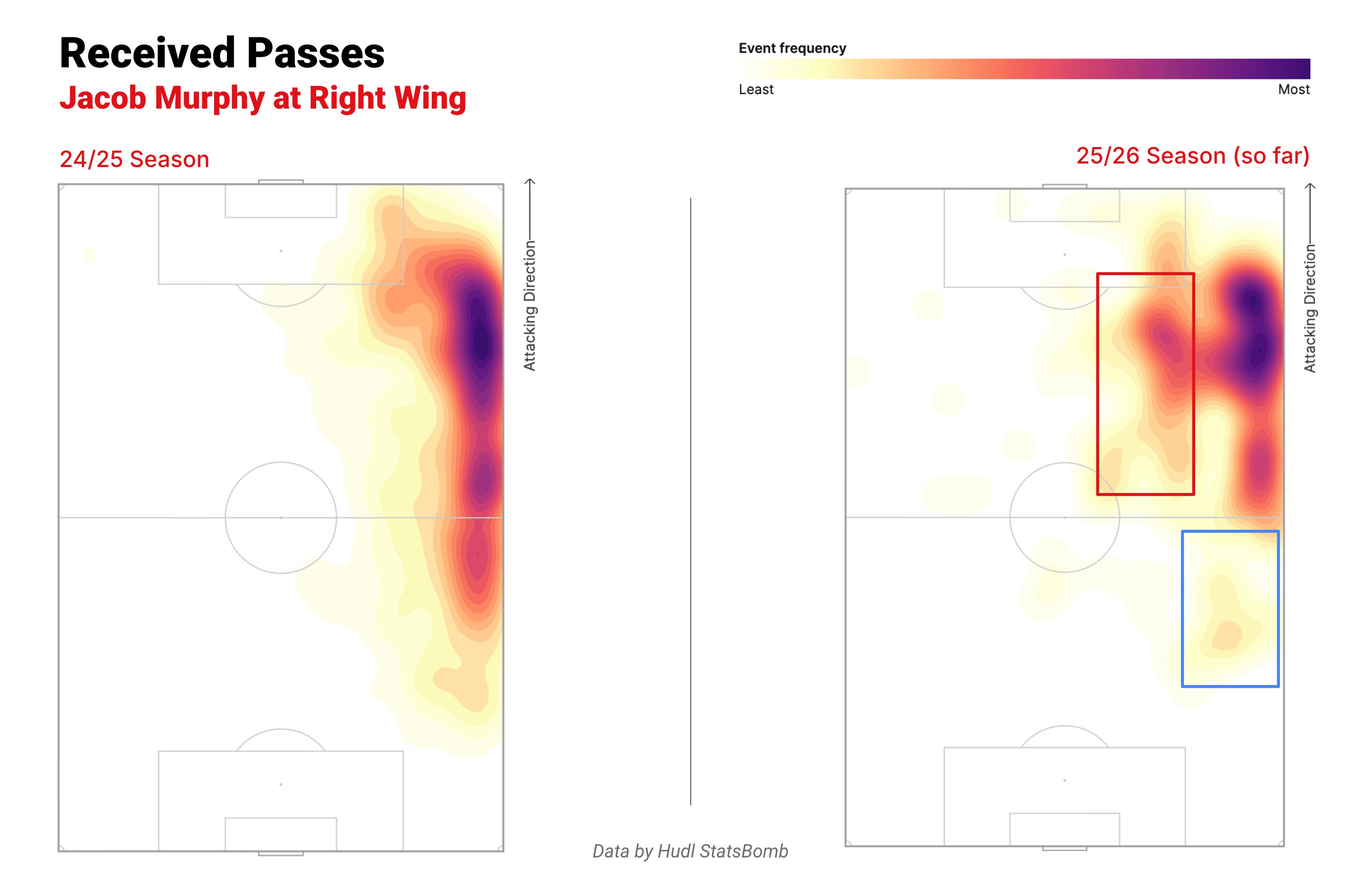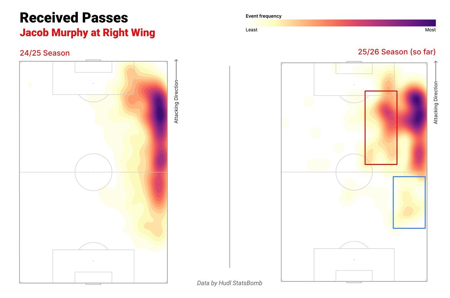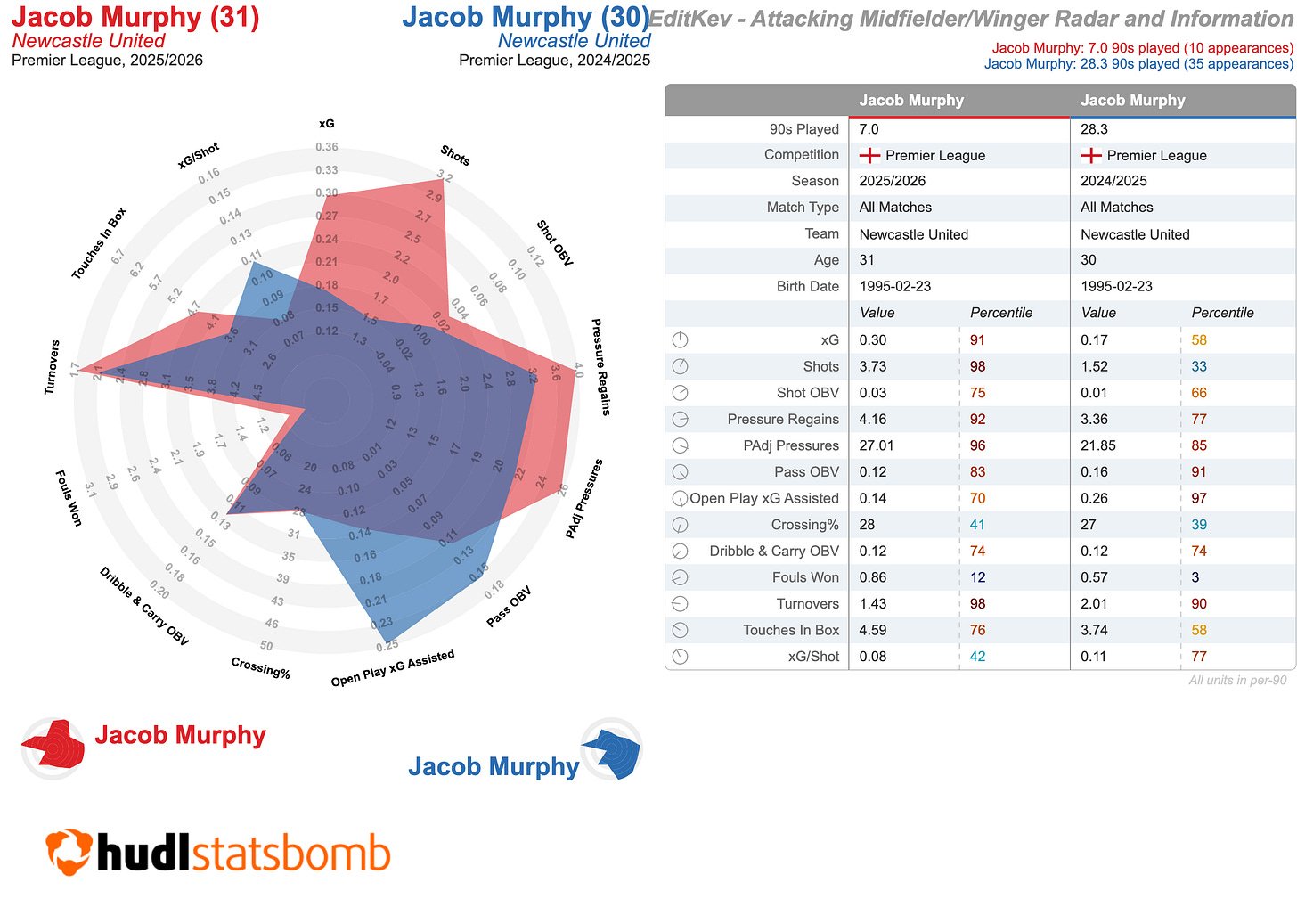 Generally, Murphy has managed to adjust better than any of Newcastle’s wingers to date, shooting more often this season 🔴, which, as these things tend to do, has impacted his league-leading creation numbers from last term 🔵.
