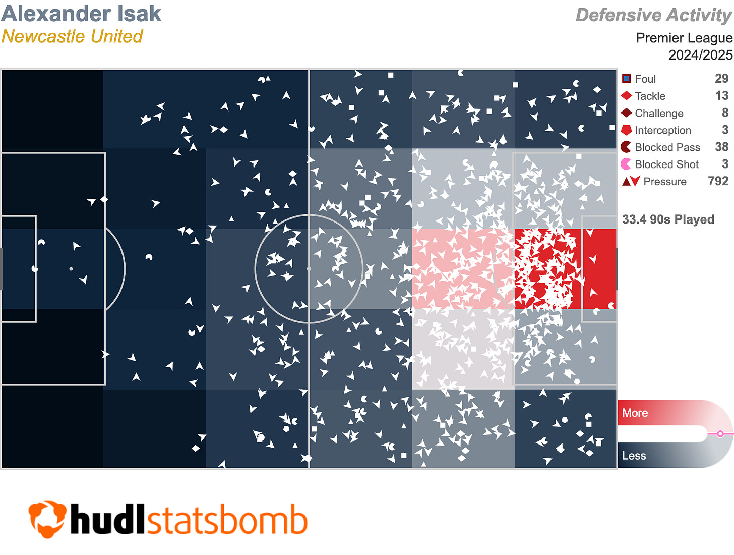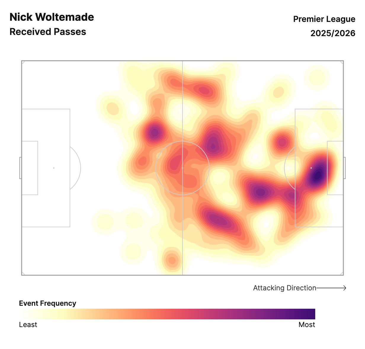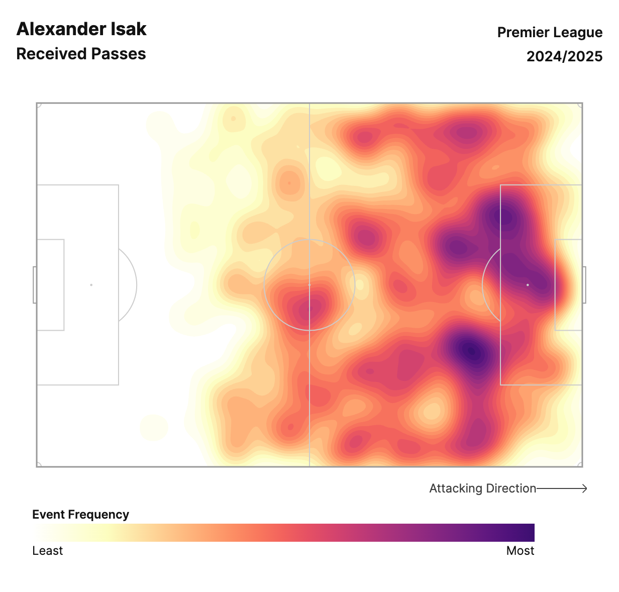 To highlight just how starkly different this is, here’s a heatmap of where Isak received the ball for Newcastle United in the Premier League last season.