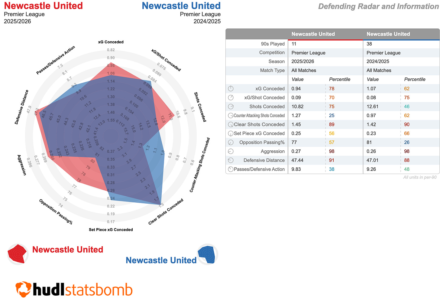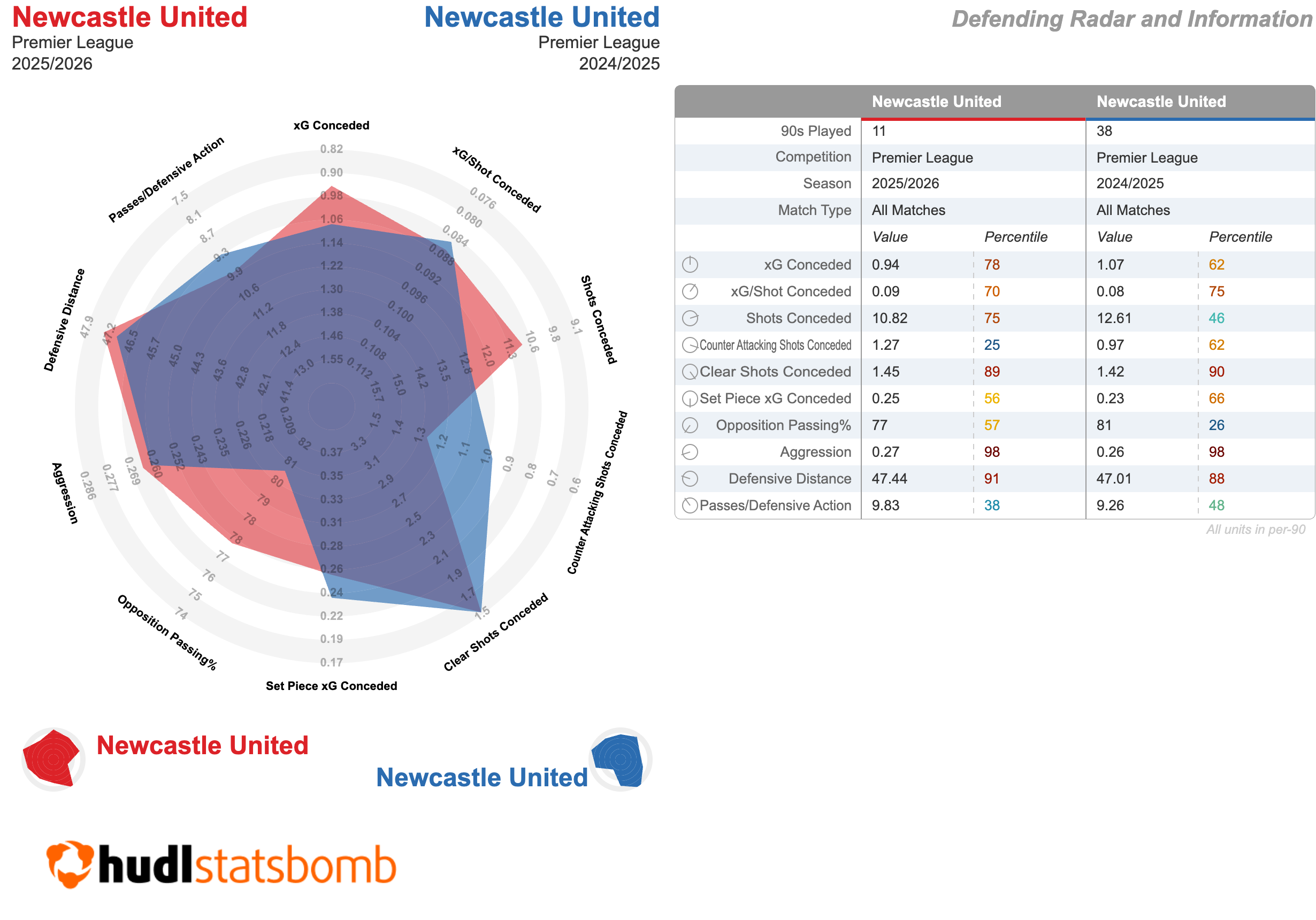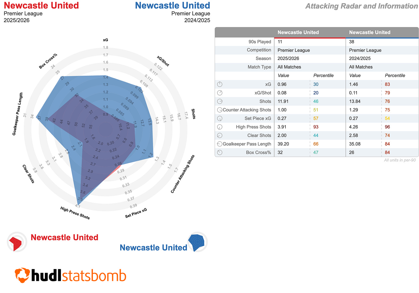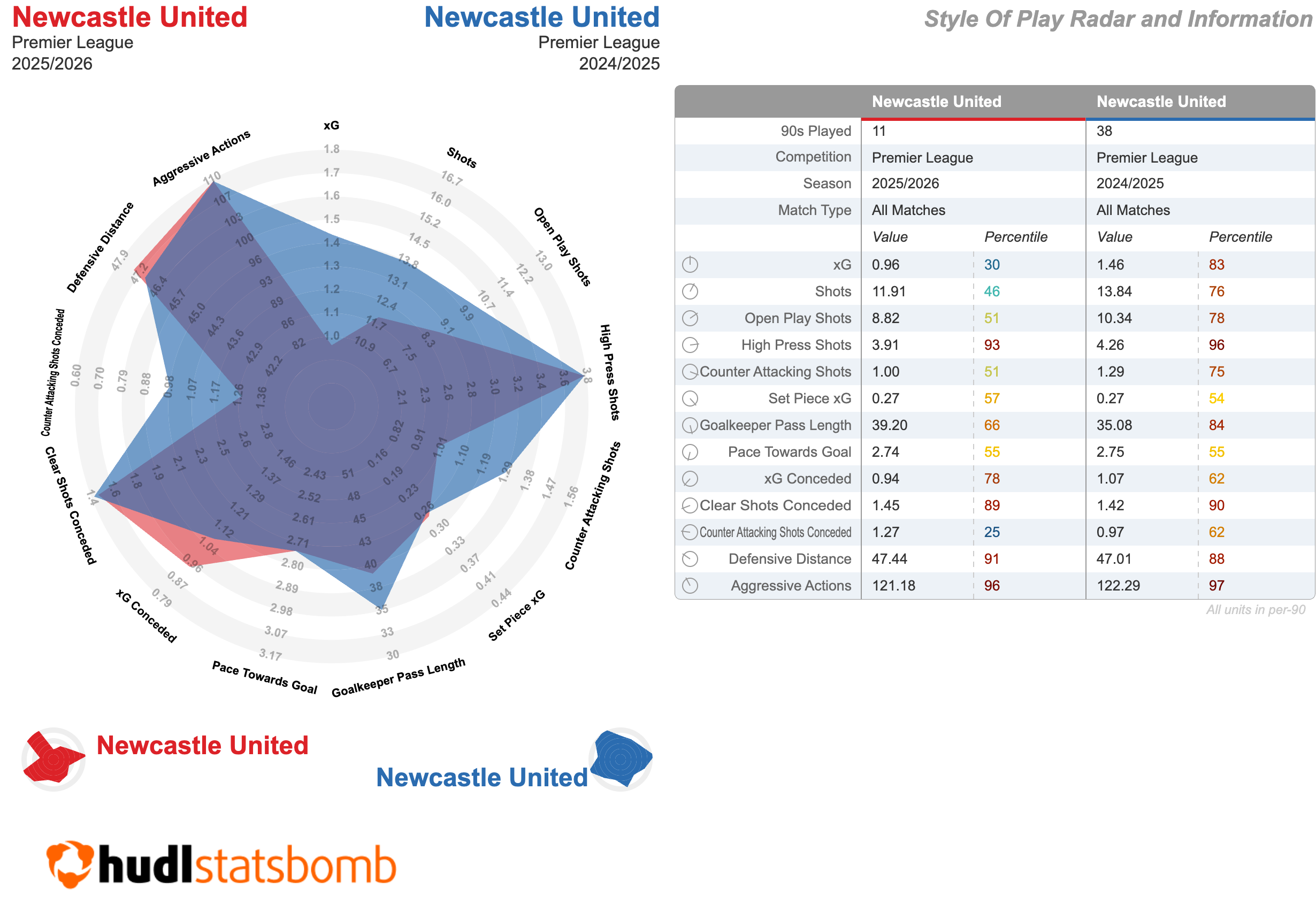 In the radar chart below, data from the 24/25 season 🔵 compared with the 11 games from the 25/26 🔴 season so far highlights that Newcastle are: