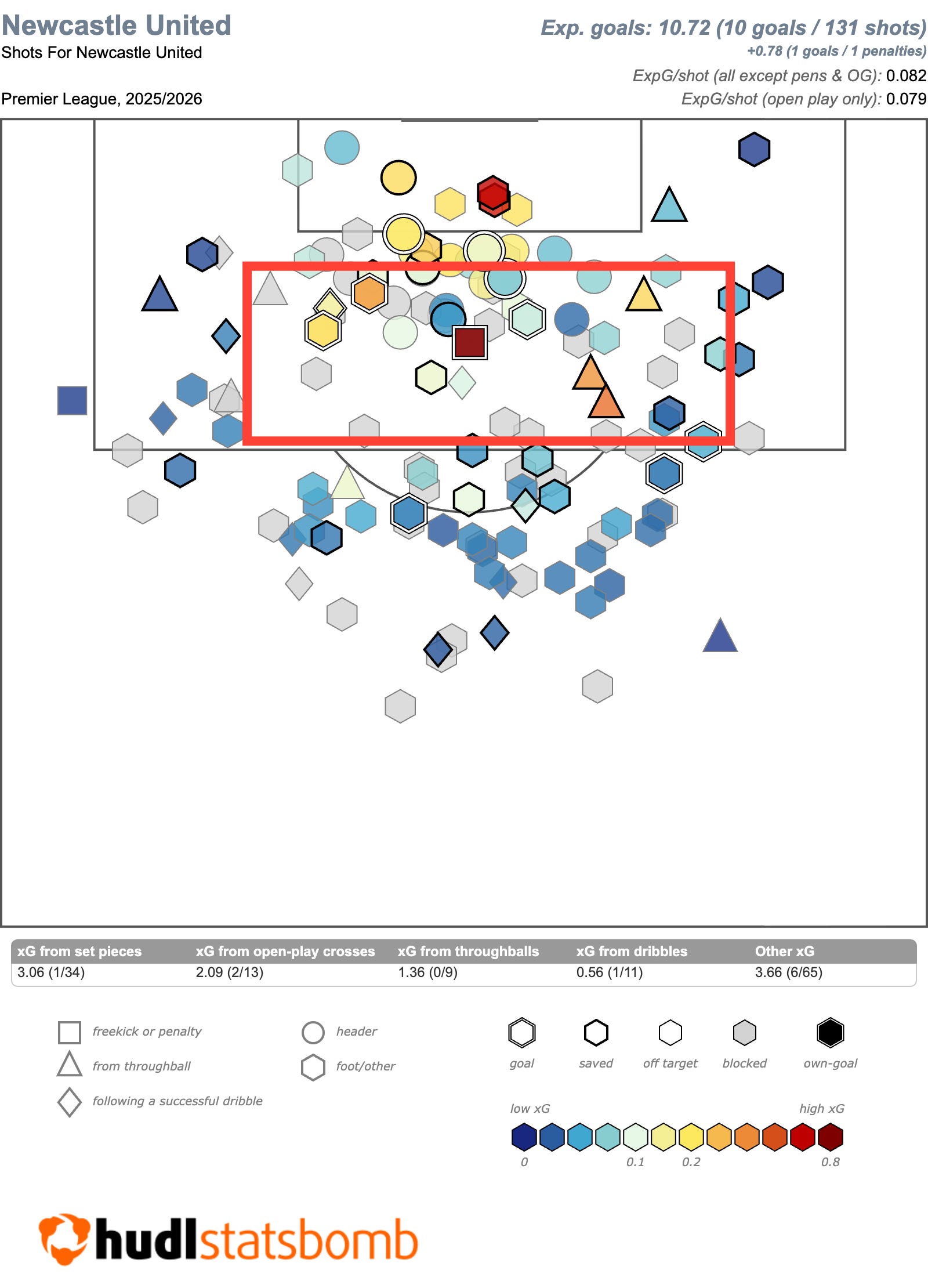 Here’s a better visual representation of how this maps to the pitch itself. Below you can see a map of all of the shots that Newcastle United have taken this season. With 10 open play goals from nearly 11 expected, we’re about on track for the season so far. Look at the density of shots from medium range in the red box.