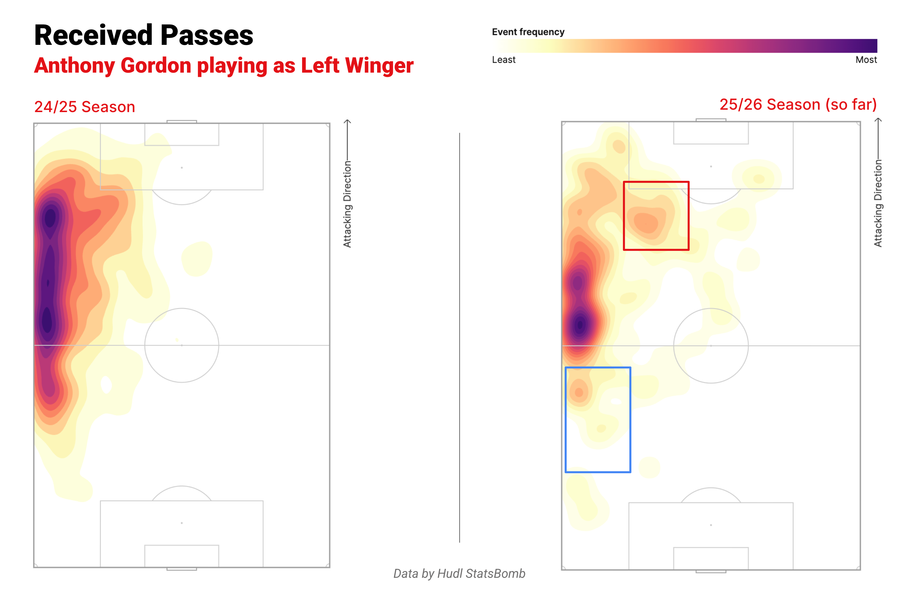 You can see this most acutely in where the wingers are getting involved with play., Now tasked with getting beyond Woltemade to offer a threat in behind, they’re dropping deep less often to get involved in build (see 🔵 square) and are more active centrally in transition and set attacking situations (see 🔴 square).