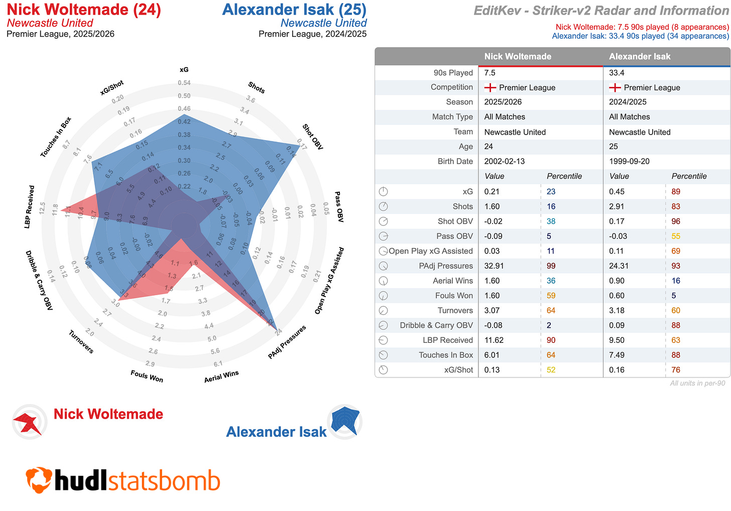 The impact of Woltemade’s receiving the ball deep, laying it off, and finishing the attack style dramatically changes the in-possession identity built over more than three seasons at Newcastle. An identity, which at least in part relied on its strikers (Isak and Wilson), to offer a last-line threat and turn defences with runs in behind, now has to find a new way to attack.