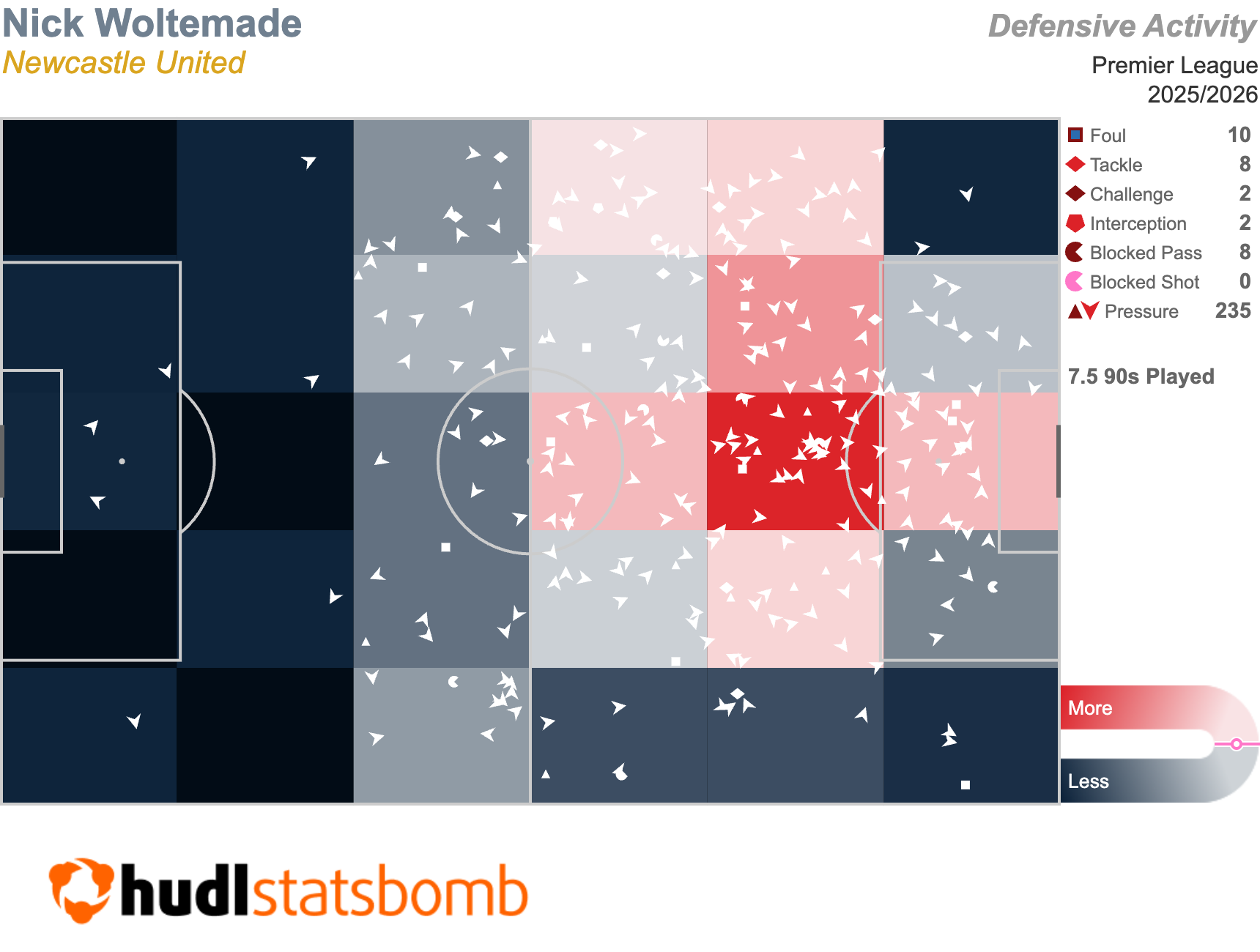 Before we wrap, one last thing about Nick is that while he may not have the burst of Isak, his work rate without the ball trumps Isak’s so far. He’s forced turnovers in possession 37 times in the opposition half and made 8 tackles. You can see his defensive activity volume visualised below.