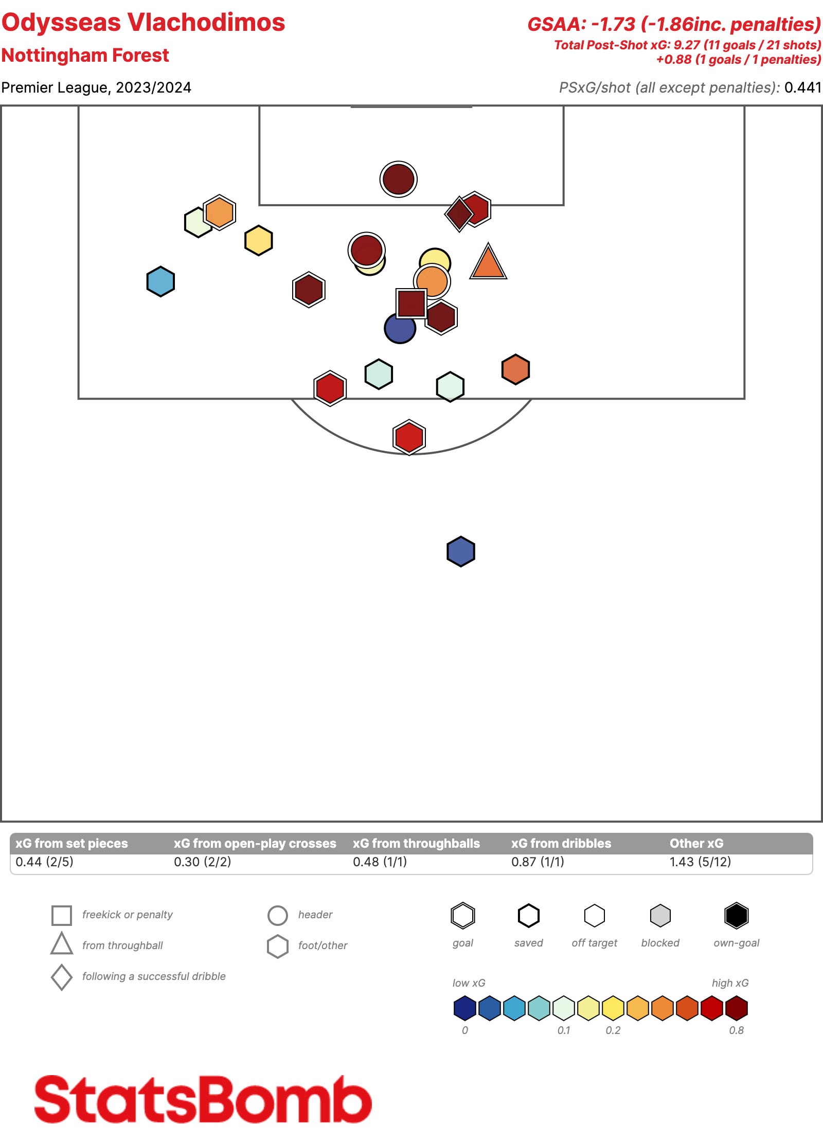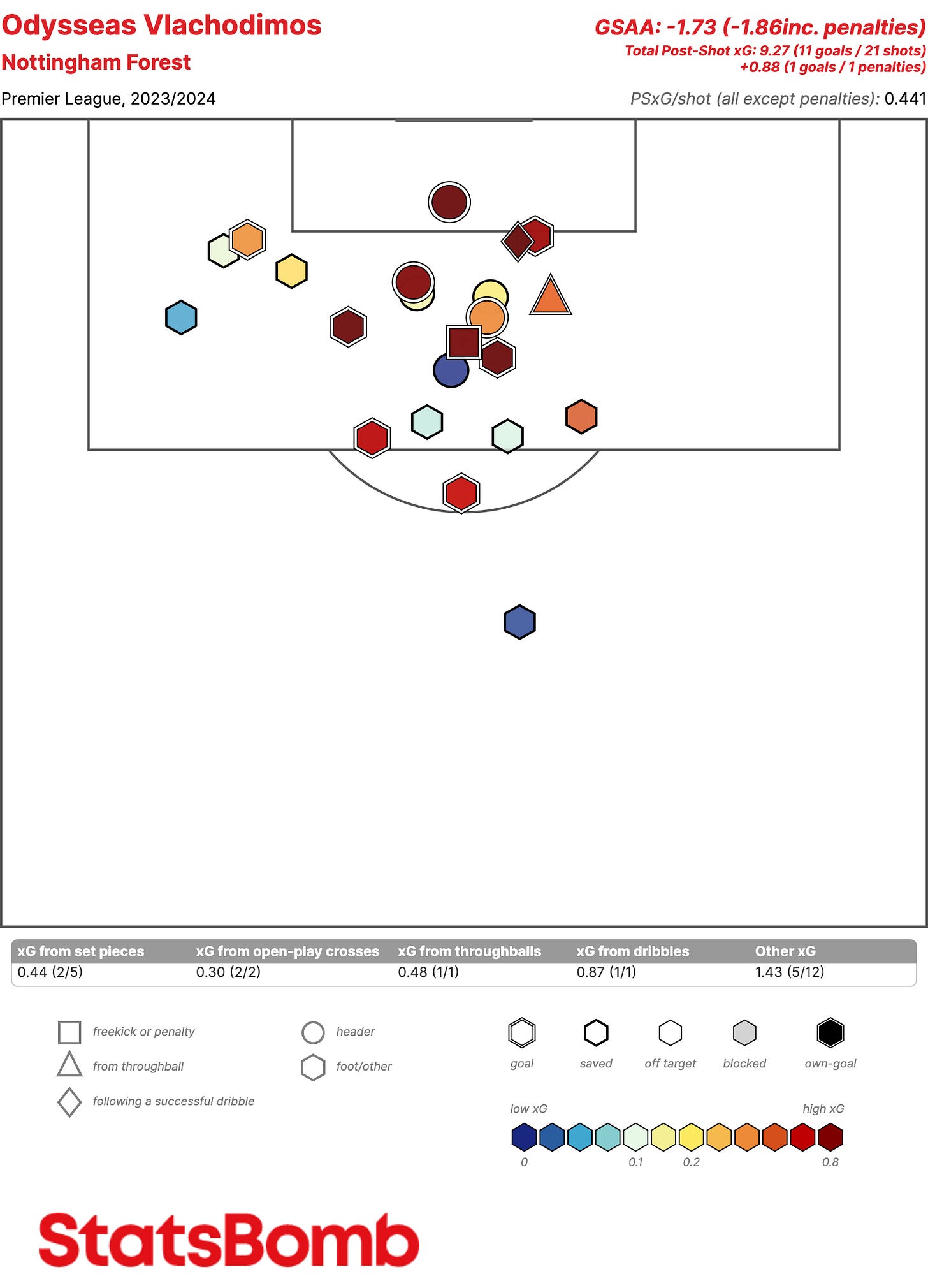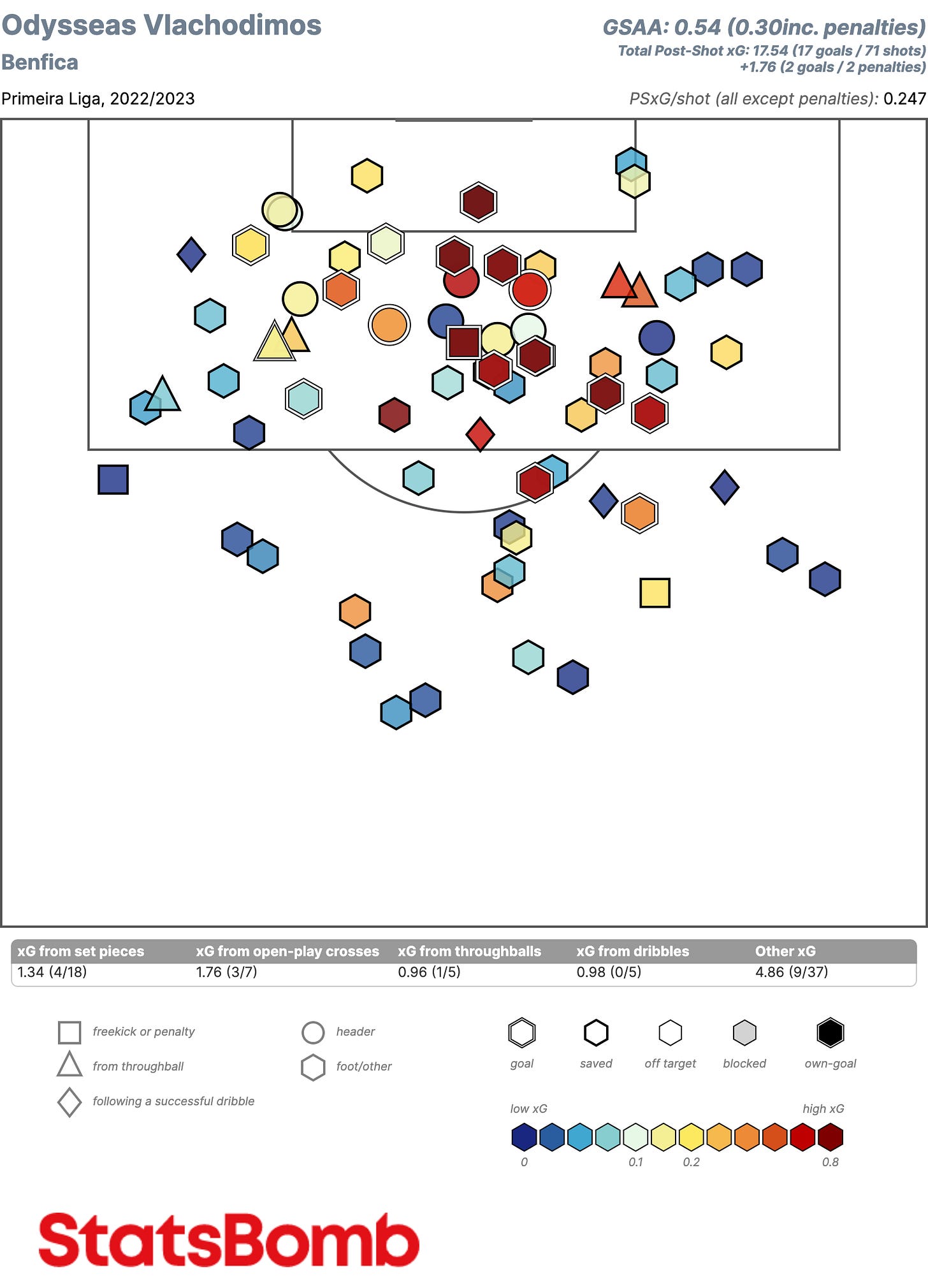 However, there’s enough in his data throughout his time at Benfica to show he’s a solid enough shot-stopper (see last Benfica season shots faced below) and when it comes to his in-possession work, Vlachodimos is genuinely good. He consistently completes 55% plus of even his longer passes and kickstarts counterattacks with them too.