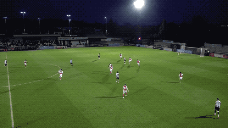 Here we see the youngster rush the opposition to play the ball all the way back from our own third to Arsenal’s Goalkeeper. He even shows enough awareness to cover the passing lane to the full back and give two midfielders the chance to win the eventual pass from the goalkeeper.